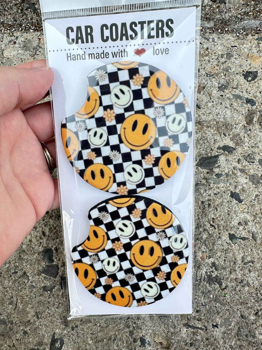 Retro Checkered Happy Face Car Coasters