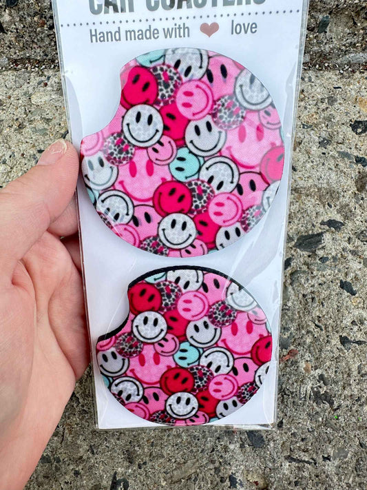 Pink Retro Happy Face Car Coasters